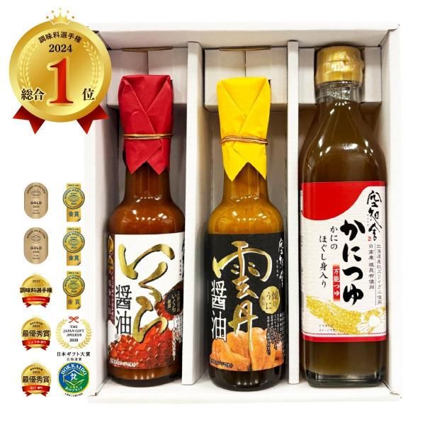 調味料選手権1位記念★3種セット いくら醤油 うに醤油 かにつゆ いくらしょうゆ 雲丹醤油 ギフトやプチギフトお土産や贈り物プレゼントに 空知舎 TV2505 【TV出演】